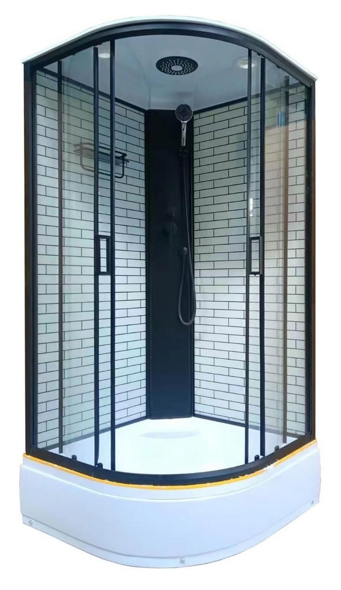 Комплектация: ПОДДОН С БОРТИКОМ, черный профиль и дуги, черная панель, верхний душ, ручной душ с держателем, стеклянная полка черная полка 8 мм, смеситель, сифон.