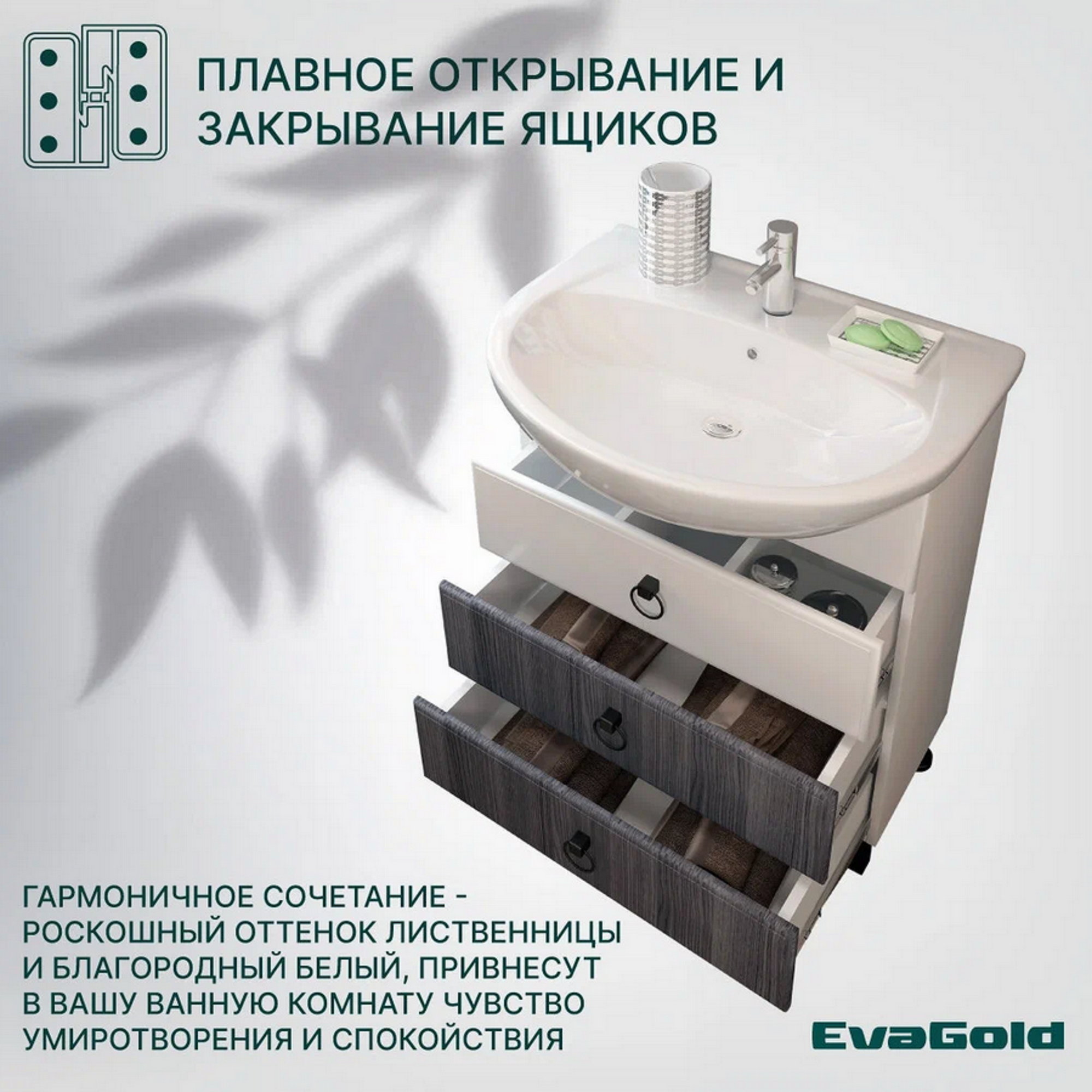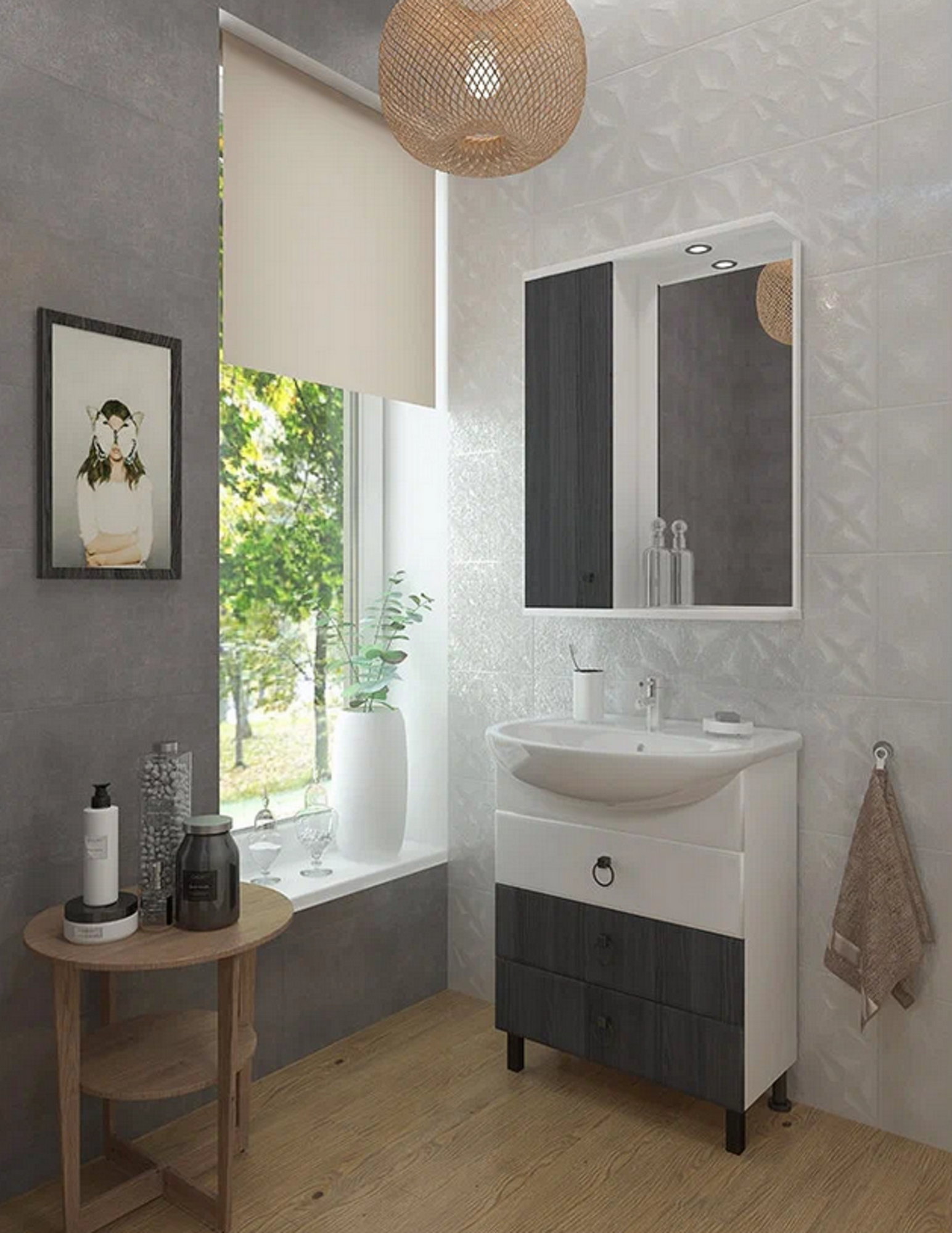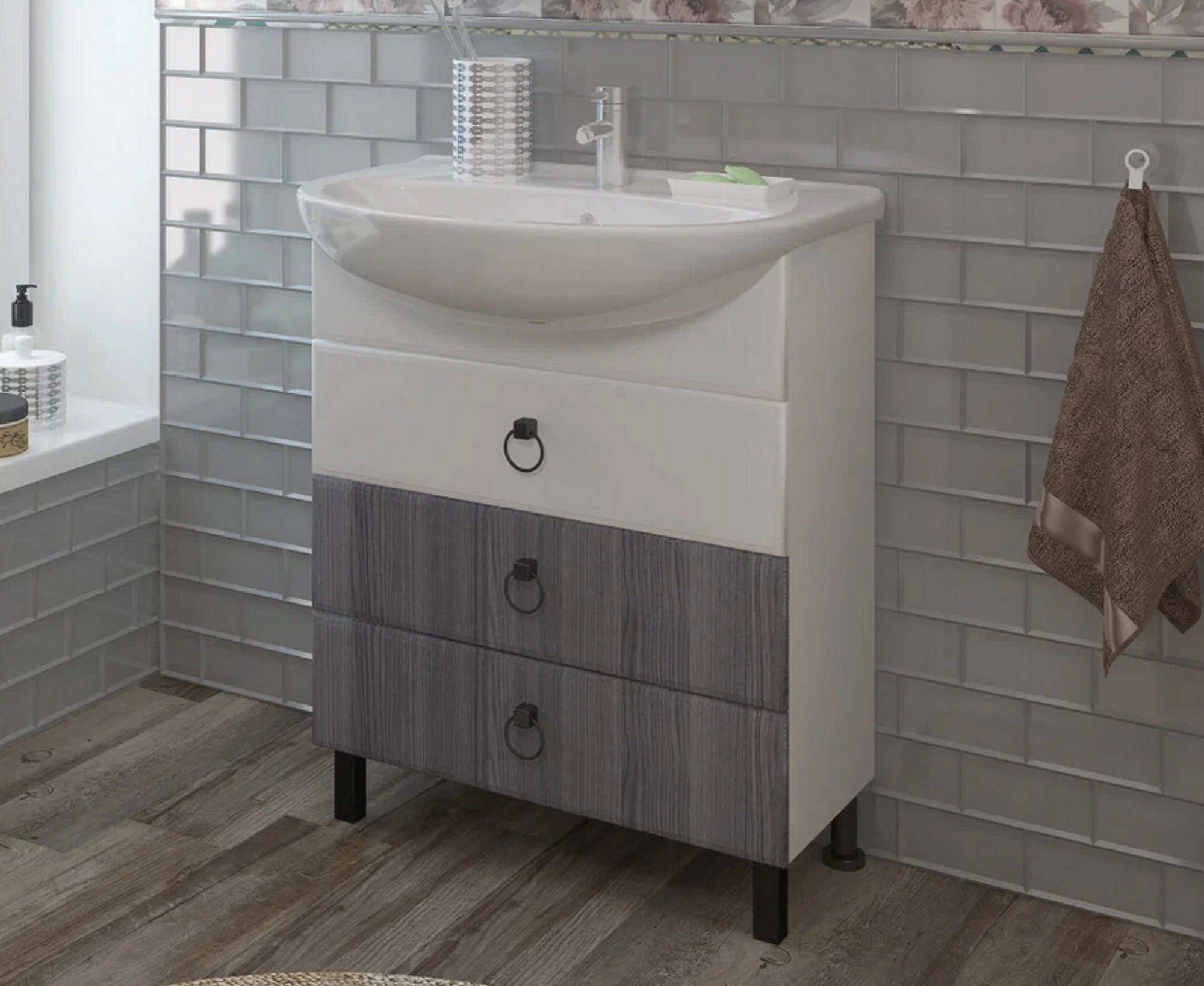 Мебель для ванных комнат в скандинавском стиле. Данный комплект выделяет интересное цветовое решение - роскошный оттенок лиственницы и благородный белый, которое привнесет чувство умиротворения и спокойствия.