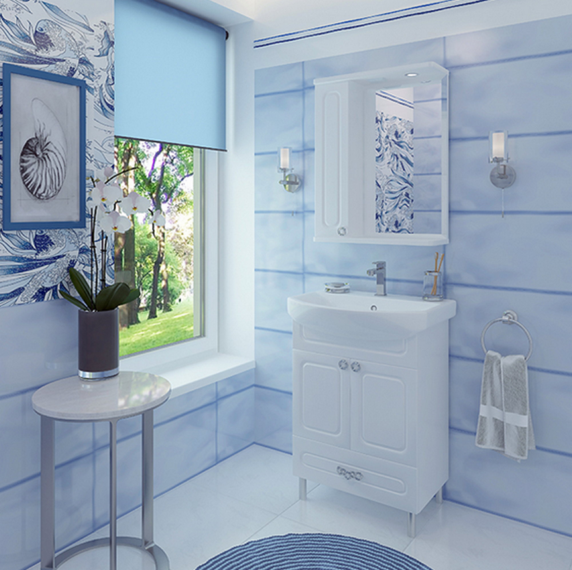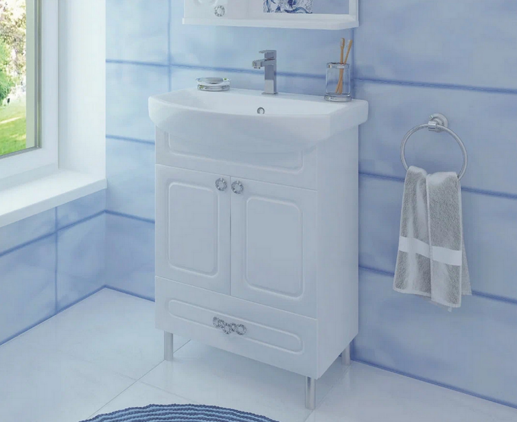 Современная и недорогая коллекция мебели для ванной комнаты, в которую входят тумба и зеркальный шкаф. Белые прямые фасады украшены минималистичной фрезеровкой в виде линий, для дверок и выдвижного ящика подобраны соответствующие ручки.