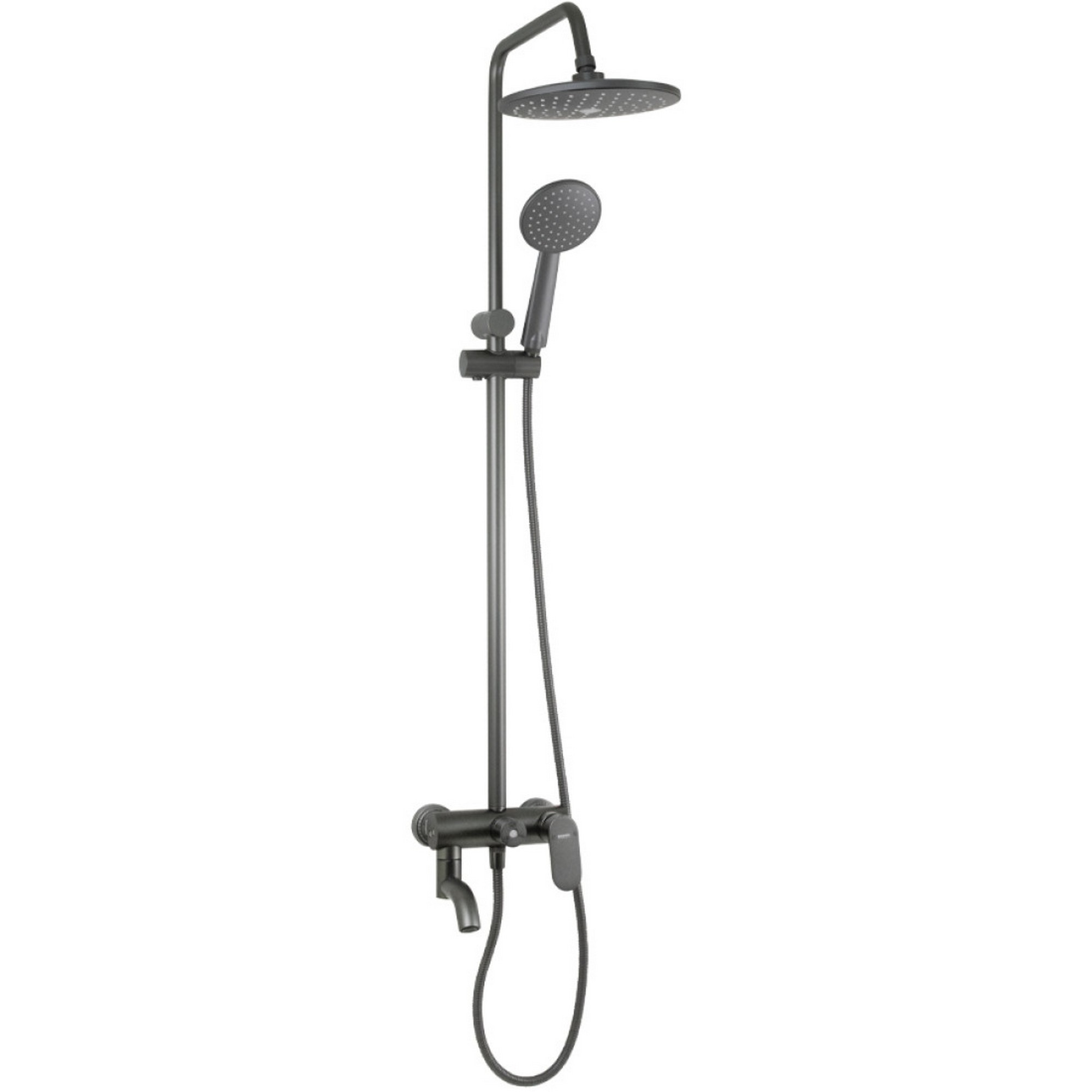 Смеситель + стойка душевая телескопическая "тропический душ" с двумя лейками в ванную / душевую комнату, из авиационного алюминия под "графит". Смеситель шаровый с дивертором м/к на корпусе с коротким поворотным изливом, душевым шлангом и лейкой. Картридж d = 40 мм, ручка литая, аэратор для экономии воды, чашки и эксцентрики. Душевая, регулируемая по высоте стойка с присоединением к корпусу смесителя и дополнительным креплением к стене и большой круглой лейкой с эффектом тропического душа. Габаритные размеры: ширина смесителя 150 мм, высота 150 мм, длина излива корпуса 135 мм, длина излива стойки 300 мм, высота телескопической стойки от 850 - 1150 мм, душевая лейка d = 115 мм, лейка тропический душ d = 230 мм, шланг 150 см.В Комплекте корпус с изливом, чашки, эксцентрики, прокладки, стойка, шланг, две лейки, крепления