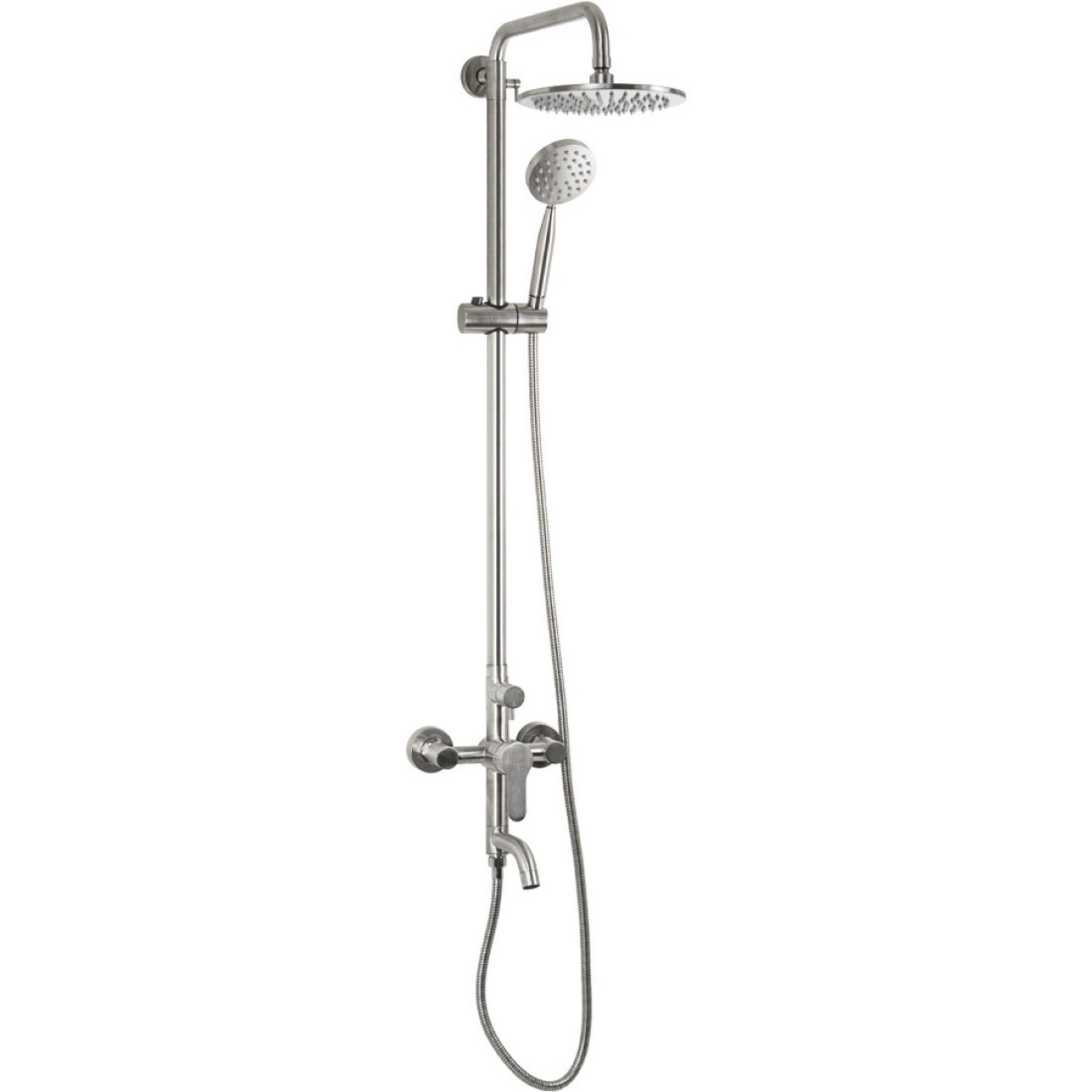 Смеситель + стойка душевая "тропический душ" с двумя лейками в ванную / душевую комнату, матовая, из нержавеющей стали марки 304. Смеситель шаровый, прямой корпус с коротким поворотным изливом, душевым шлангом и лейкой, дивертор переключения в трёх положениях. Картридж d = 35 мм, ручка литая, аэратор для экономии воды, чашки и эксцентрики. Душевая стойка с присоединением к корпусу смесителя и дополнительным креплением к стене и большой круглой лейкой с эффектом тропического душа. Габаритные размеры: ширина смесителя 150 мм, высота 280 мм, длина излива корпуса 120 мм, высота стойки 850 - 1150 мм, длина излива стойки 340 мм, круглая душевая лейка 90 мм, круглая лейка тропический душ 195 мм, шланг 150 см. В комплекте корпус с изливом, чашки, эксцентрики, прокладки, стойка, дивертор, шланг, две лейки, крепления.