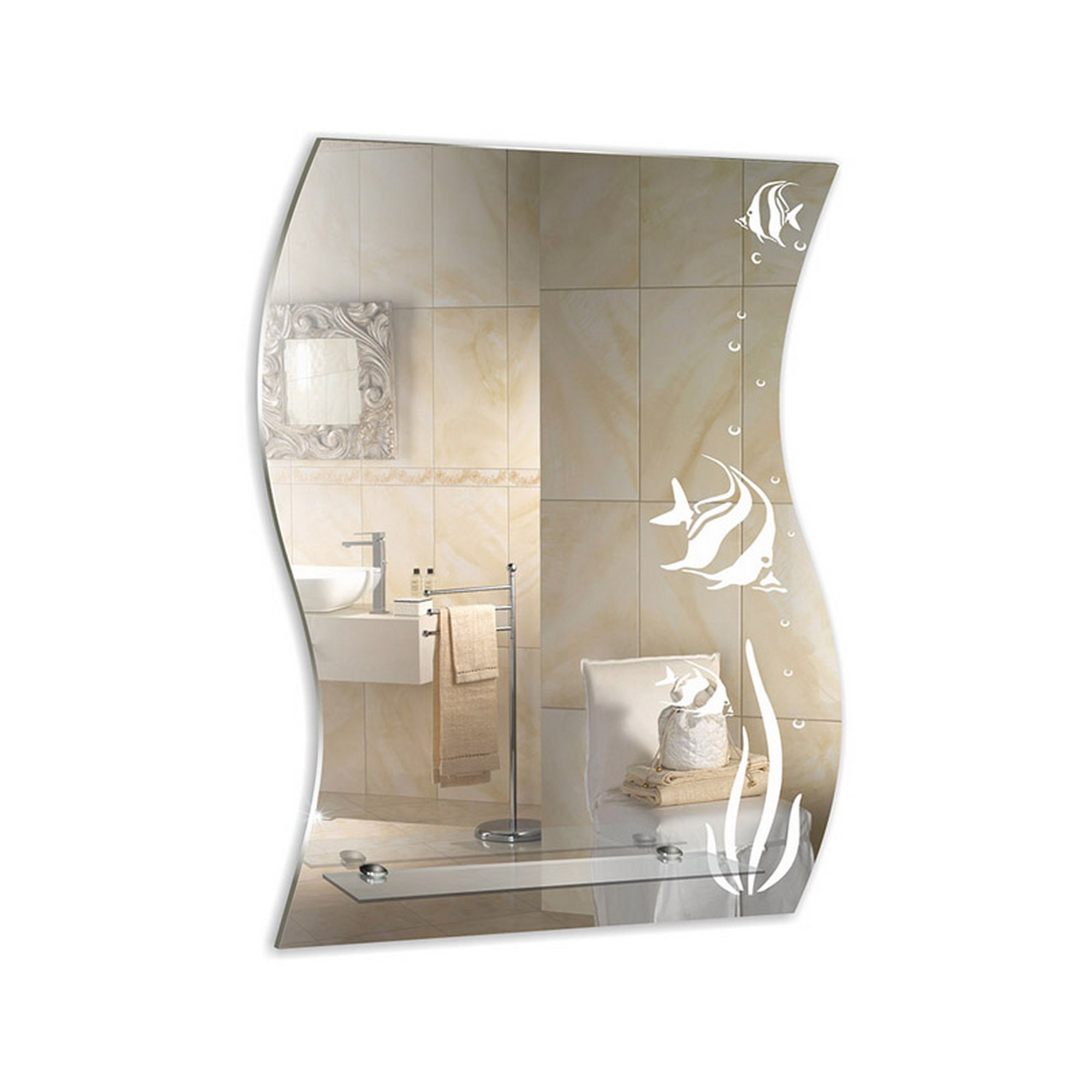Зеркало не стандартной формы, с необычным принтом, с полкой.